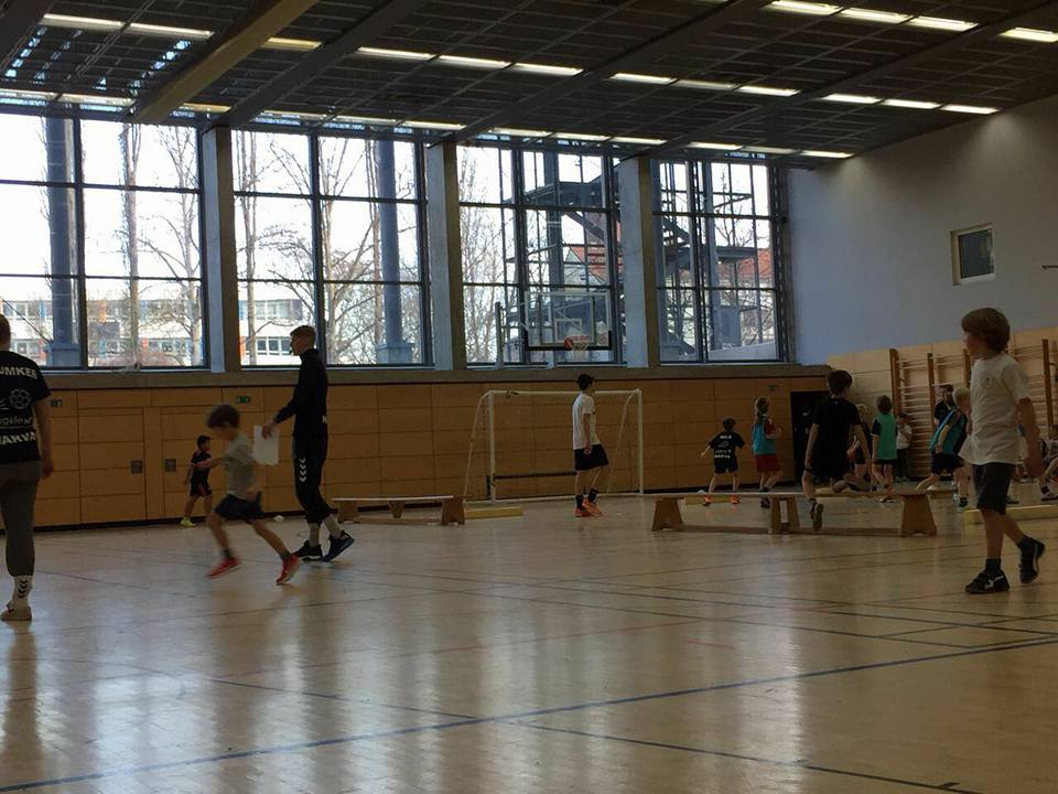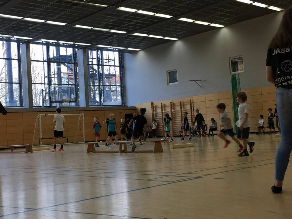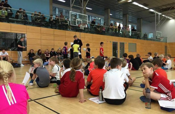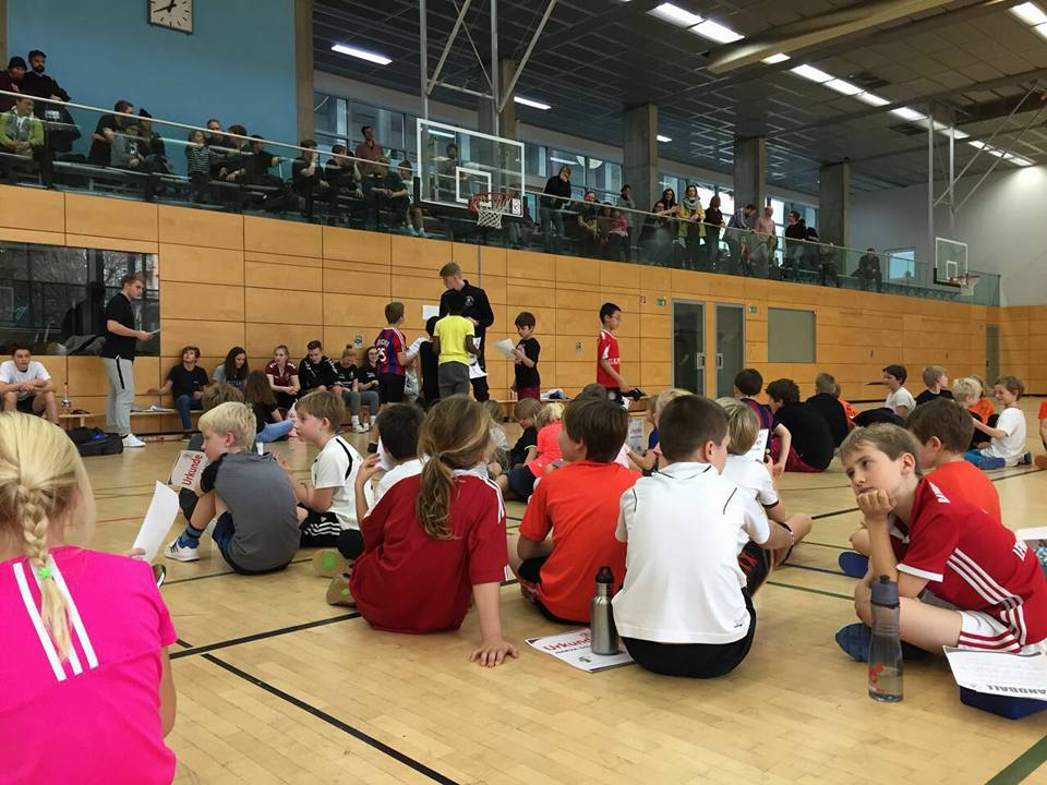 Nach einer kurzen Einweisung von Felix trudelten auch schon die ersten Kinder ein und machten sich mit der Spielfläche bekannt. Um 9 Uhr hieß es „herzlich Willkommen“ an alle 53 teilnehmende Kinder und deren mitgereiste Eltern und Freunde. Die folgende Erwärmung übernahm Robert, was zu einer massiven Bein-und Armbewegung von 53 Kindern führte. Es folgte die Einteilung der sieben Teams, und der Spaß konnte beginnen. Ein Turnier über dreieinhalb Stunden startete um 9:15 mit einer unglaublichen Lautstärke, die messbar für den Spaß von uns gewertet wurde. Nach circa der Hälfte der Spiele fand ein Stationsbetrieb statt, der das Spaßlevel dieser wunderbaren Veranstaltung nochmal hob. Auch im zweiten Durchgang der Spiele haben wir sehr gute und unterhaltsame Begegnungen sehen können und für jeden Teilnehmer und Zuschauer gab es eine Menge zu lachen und zu staunen.