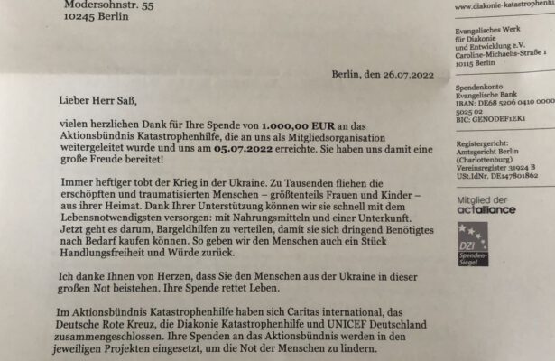 Dieser Betrag wurde zu etwa gleichen Teilen vom Hauptverein (250,00 Euro) und der Abteilung Handball (230,00 Euro) auf insgesamt 1000,00 Euro aufgestockt und an die Diakonie Katastrophenhilfe weitergeleitet. Deren Dankesschreiben wollen wir euch nicht vorenthalten und hoffen, dass diese akute Hilfe gut ankommt und auf ein baldiges Ende des Krieges.