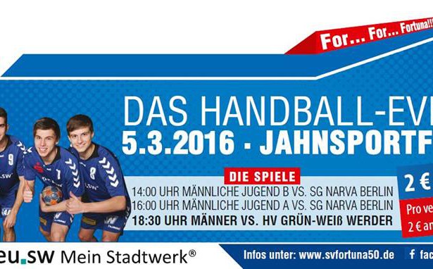 Den vorletzten Spieltag der Ostsee-Spree-Liga (Jugend) nutzt der SV Fortuna Neubrandenburg zu einem großen Heim-Event im 2300 Zuschauer fassenden Jahnsportforum. Und dazu möchten wir euch ebenfalls einladen. Ein Reisebus ist bestellt und der Preis durch einen Sponsoren bereits erheblich reduziert. Zusammen mit den Teams der mA- und mB-Jugend werden also 40 von euch ebenfalls in die „Vier-Tore-Stadt“ reisen, um unsere Jungs zu unterstützen und dem vermutlich ausverkauften Spiel der Oberliga Männer, Fortuna Neubrandenburg – Grün Weiß Werder, beizuwohnen.