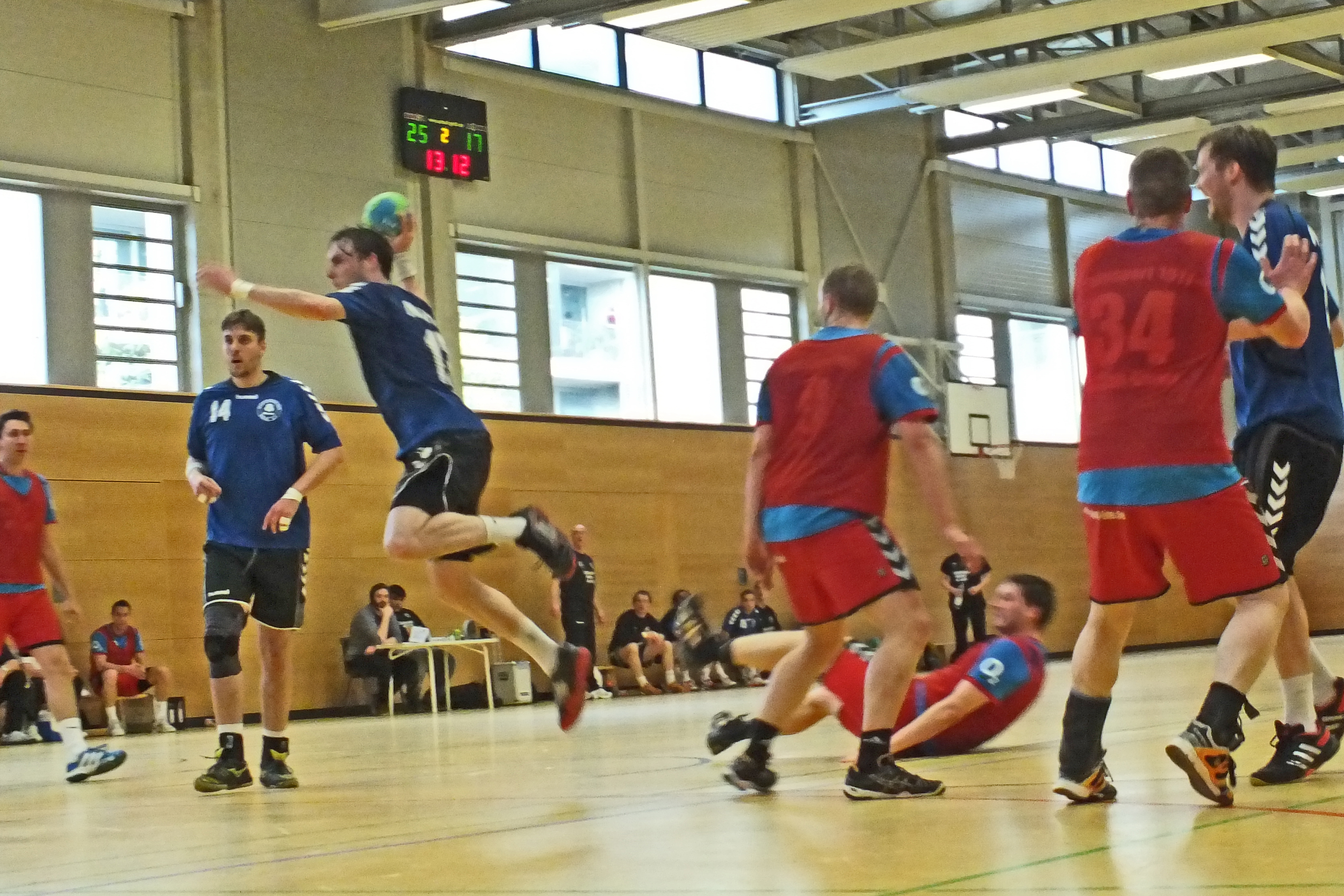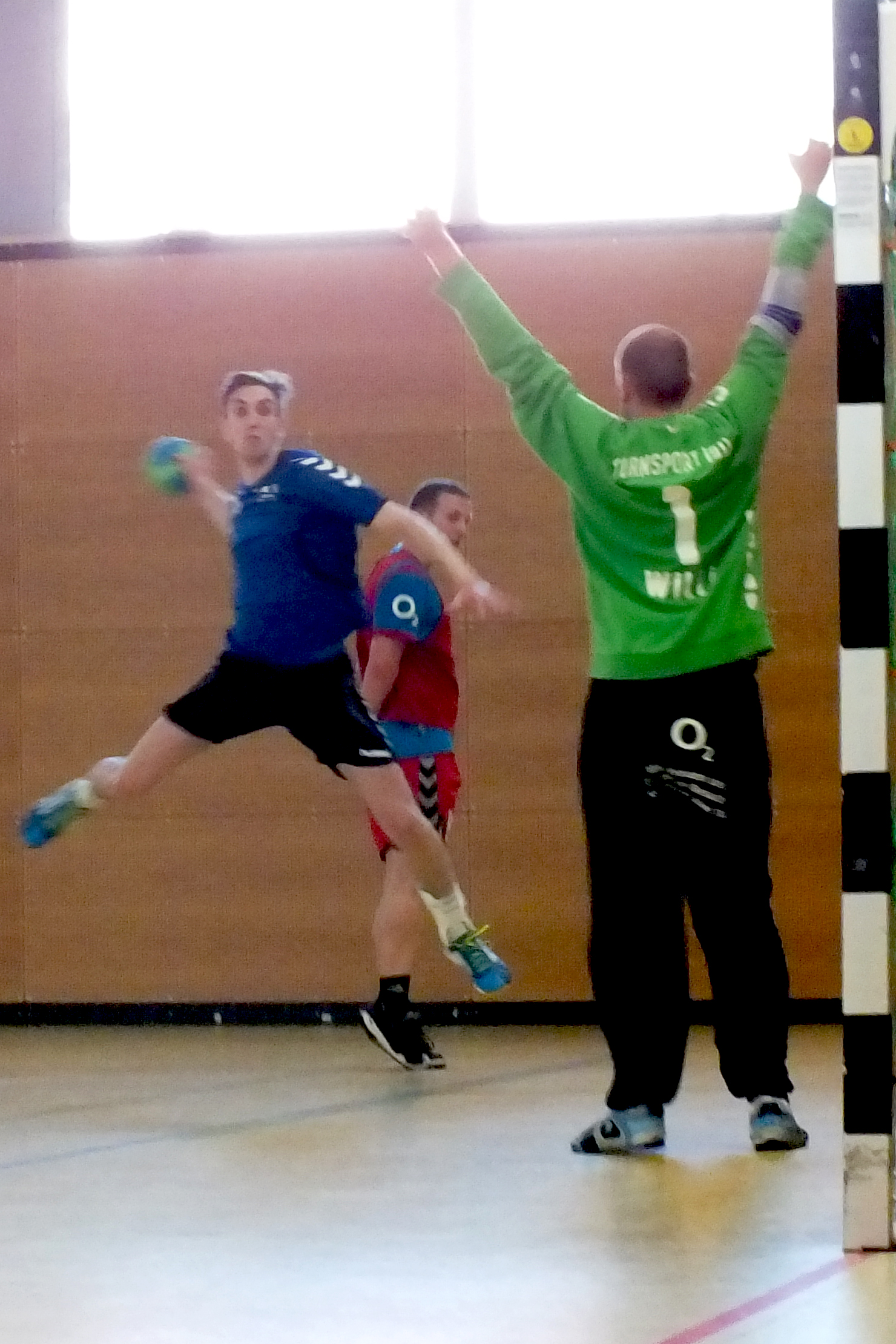 Nach einem recht ausgeglichenen Start war schon sehr früh der Siegeswillen der Narvaziner zu erkennen, da sie sich über ein 6:2 und 10:5 auf ein 14:7 absetzten. Vor allem der stark aufgelegte Torwart Tino konnte dabei oftmals mit starken Paraden glänzen, nicht nur aufgrund der durch ohne Harz bedingt schlechten Wurfausbeute der Turnsportler. Nach einer darauffolgenden kurzen Schwächephase des narvianischen Teams trennte man sich zur Halbzeit mit 17:11.