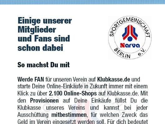 Werde FAN für unseren Verein auf Klubkasse.de und starte Deine Online-Einkäufe in Zukunft immer mit einem Klick zu über 2.100 Online-Shops auf Klubkasse.de. Mit den Provisionen auf Deine Einkäufe füllst Du die Klubkasse unseres Vereins und kannst bei jeder Ausschüttung mitbestimmen, für welchen Zweck das Geld im Verein eingesetzt werden soll. Für dich bedeutet das einen Klick mehr, aber keine Mehrkosten.